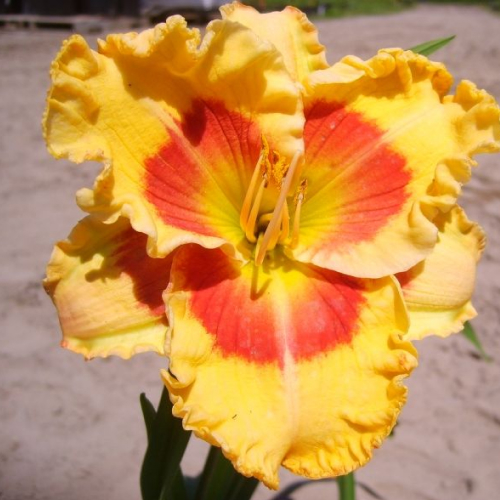 Лилейник X-Factor (Икс-Фактор) - это гибридный сорт, который привлекает внимание своими крупными, светло-золотисто-розовато-желтыми цветками диаметром до 20 см. Взрослое растение достигает высоты 60 см, что делает его идеальным для создания ярких акцентов в саду.