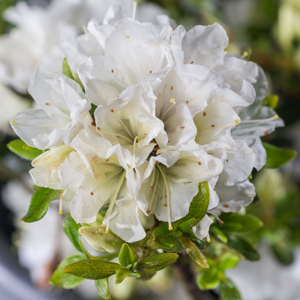 Рододендрон азалия "Панда" (белый) представляет собой вечнозеленый, компактный кустарник с полумахровыми соцветиями. Этот низкорослый сорт отличается ярко-белыми цветками, которые собраны по три на концах побегов. Диаметр каждого цветка составляет от 4 до 4,7 см. Период цветения приходится на июнь.